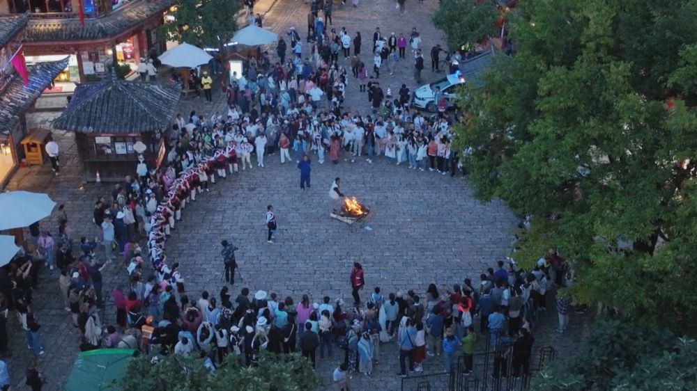 丽江古城四方街篝火晚会航拍。(丽江融媒记者 和泳华 摄)