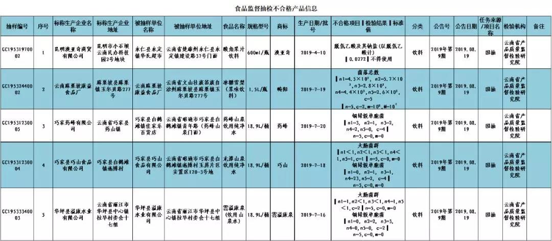 据了解,对昆明澳亚奇商贸有限公司、云南麻栗坡康益食品厂、巧家药峰有限公司、巧家县巧山食品有限公司、华坪县溢康水业有限公司抽检中发现的不合格产品,云南省市场监督管理局将责成企业所在地监管部门按照《中华人民共和国食品安全法》的规定,责令生产经营企业及时采取下架、召回等措施,进一步调查处理,查明生产不合格产品的批次、数量和成因,制定整改措施。