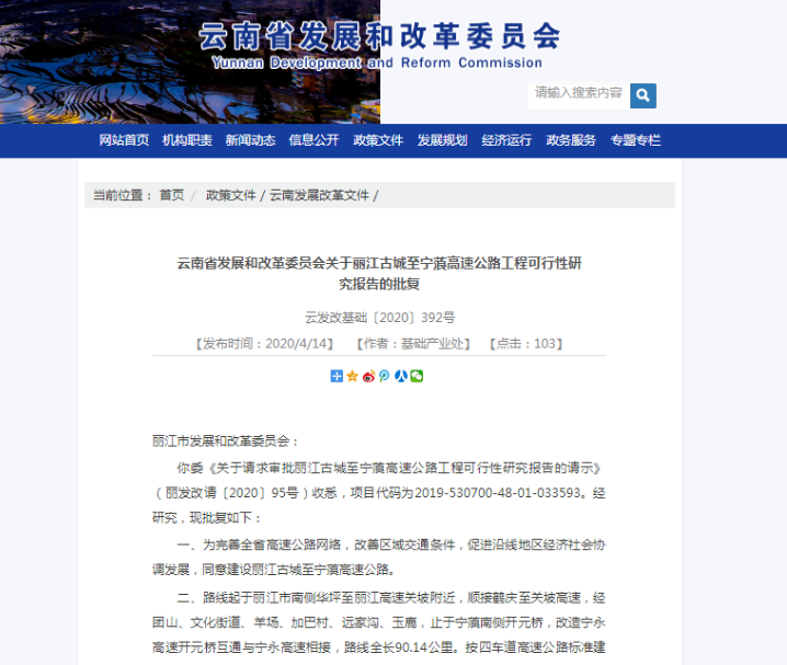 4月14日,云南省发展和改革委员会印发《关于国家高速公路网G5615天保至猴桥高速公路天保至文山段工程可行性研究报告的批复》(云发改基础〔2020〕390号)、《关于G248线砚山至文山段改扩建工程可行性研究报告的批复》(云发改基础〔2020〕391号)、《关于丽江古城至宁蒗高速公路工程可行性研究报告的批复》(云发改基础〔2020〕392号)、《关于孟连至勐海高速公路工程可行性研究报告的批复》(云发改基础〔2020〕393号),批复同意建设国家高速公路网G5615天保至猴桥高速公路天保至文山段、改扩建G248线砚山至文山段公路、建设丽江古城至宁蒗高速公路、建设孟连至勐海高速公路。