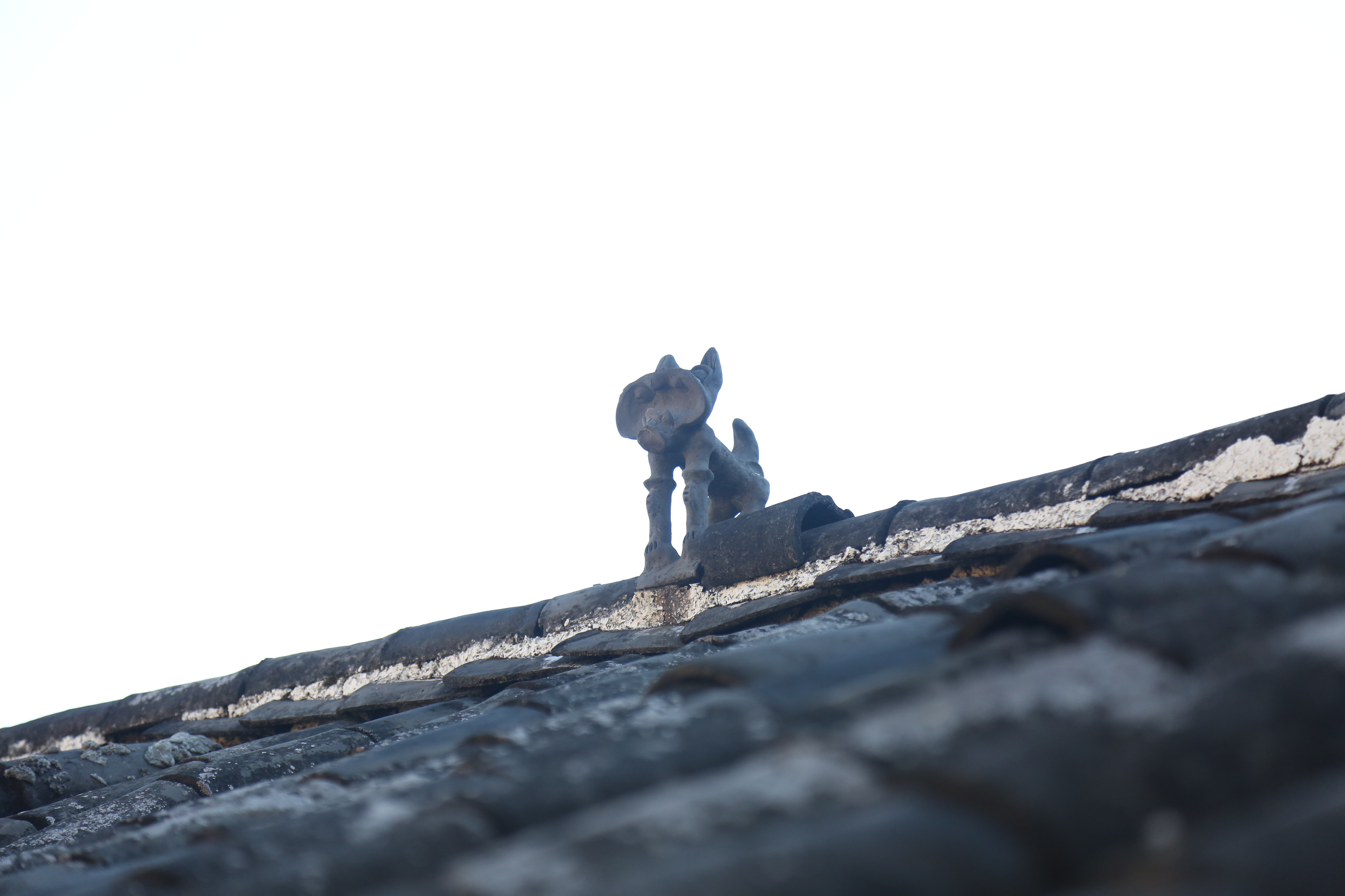 屋顶正中央塑立着张牙舞爪的神兽,面目狰狞、凶神恶煞,形似张着大口的怪猫,当地人称为“瓦猫”,跟内地供奉貔貅一样,都有镇宅、挡灾、辟邪、招财的用途,如果主人家的房屋外面是荒地,或者大门对着别人家的房屋,瓦猫就头朝外尾朝里,如果家宅的风水特别好,也会头朝里尾朝外来塑立。