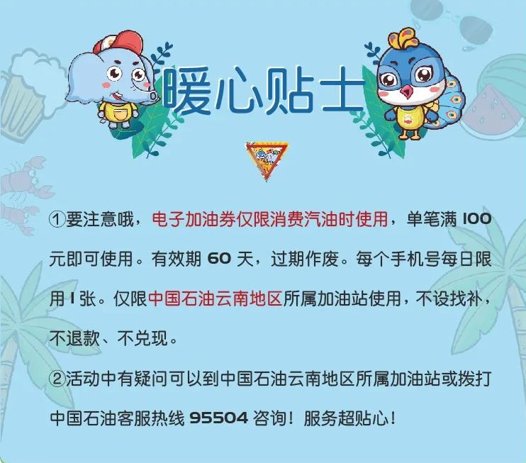下载并登陆“中油好客e站”APP,在首页轮播图处点击“加油.彩云南”,就可以进入电子加油券的领取界面,按照提示操作即可轻松领取总额60元的电子加油券!