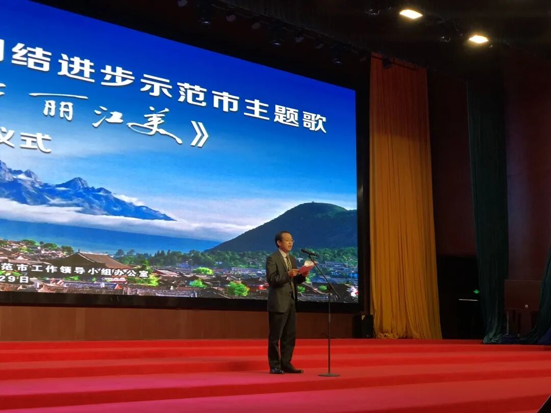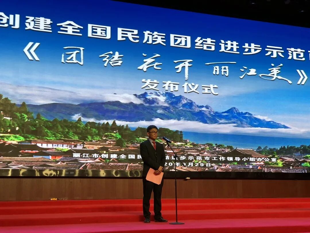 市民族宗教事务局党组书记、局长杨学文作主题歌创作说明,并宣布丽江市创建全国民族团结进步示范市主题歌《团结花开丽江美》正式发布。市民族宗教事务局副局长、市藏传佛教寺庙管理局局长杨建勋主持发布仪式。