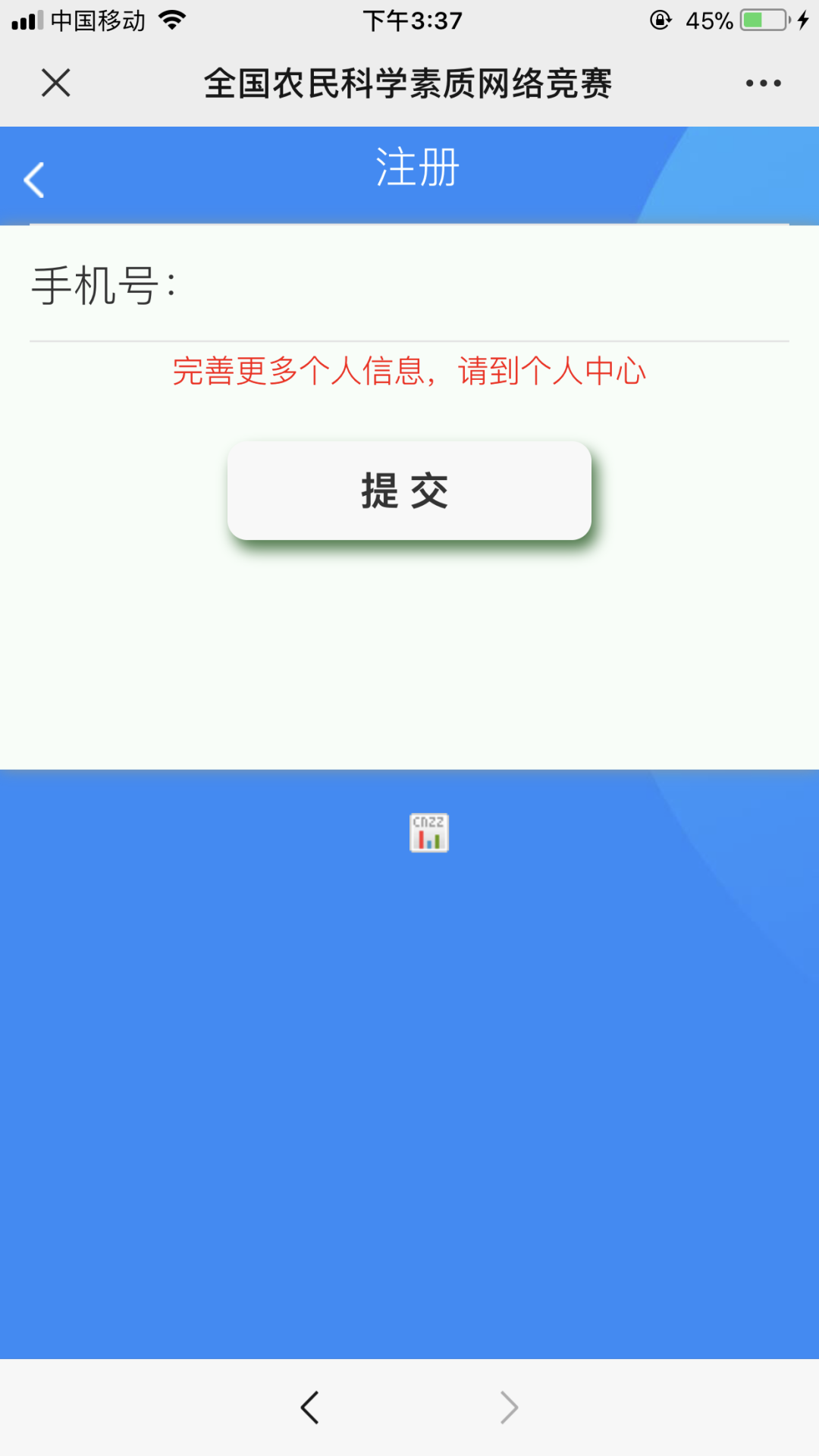 点击活动页面上“点击参与竞赛”的按钮,并注册账户,在“我的”中填写个人信息。