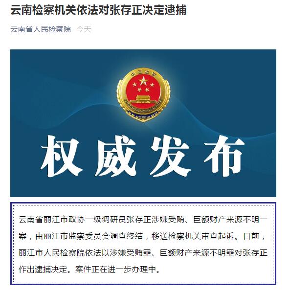 云南省丽江市政协一级调研员张存正涉嫌受贿、巨额财产来源不明一案,由丽江市监察委员会调查终结,移送检察机关审查起诉。日前,丽江市人民检察院依法以涉嫌受贿罪、巨额财产来源不明罪对张存正作出逮捕决定。案件正在进一步办理中。