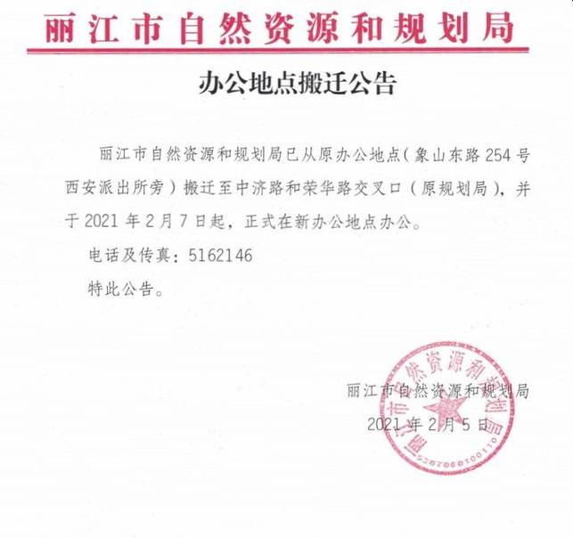 丽江市自然资源和规划局已从原办公地点(象山东路254号西安派出所旁)搬迁至中济路和荣华路交叉口(原规划局),并于2021年2月7日起,正式在新办公地点办公。