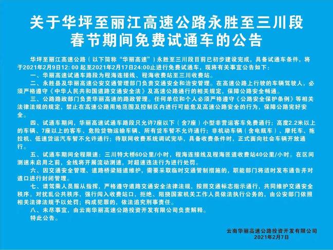 关于华坪至丽江高速公路永胜县城至三川段 春节期间免费试通车的公告 华坪至丽江高速公路(以下简称“华丽高速”) 永胜县城至三川段目前已初步建设完成,具备试通车条件,将于2021年2月9日12: 00 起至2021年2月17日24:00止进行免费试通车,现将有关事宜公告如下: 一、华丽高速试通车路段为程海连接线、程海收费站至三川收费站。 二、永胜县及华丽高速公安交通管理部门负责交通安全和治安管理。在高速公路上行驶的车辆驾驶人,必须严格遵守《中华人民共和国道路交通安全法》及高速公路通行的相关规定,保障公路安全畅通。 三、公路路政部门负责华丽高速的路政管理。任何单位和个人必须严格遵守《公路安全保护条例》等相关法律法规的规定,禁止在高速公路用地范围及控制区内进行可能危及高速公路安全的行为,保障公路完好安全。 四、试通车期间,华丽高速试通车路段只允许7座以下(含7座)小型非营运客车免费通行;高度2.2米以上的车辆、7座以上的客车、危险货物运输车辆、所有货车暂不允许通行;非机动车辆(含电瓶车)、摩托车、拖拉机、低速货运汽车暂不允许通行;待联网收费系统调试完毕,具备收费条件时,正式面向社会车辆开放通行。 五、试通车期间全程限速:三川特大桥60公里/小时,程海连接线及程海匝道收费站40公里/小时。在区间测速未启用之前,全线将开展流动测速,对超速违法行为进行处罚。 六、因交通安全管理、道路桥梁隧道维护,需要采取临时交通管制措施的,职能部门将适时发布通告并对道口进行封闭管理。 七、请驾乘人员服从指挥,严格遵守道路交通安全法律法规,按照交通标志指示通行,共同维护交通安全秩序。对扰乱公共秩序,强行闯入收费站口,拒绝、阻挠国家机关工作人员依法执行公务的,由公安部门依照相关法律法规予以处罚;构成犯罪的,依法追究刑事责任。 八、未尽事宜,由云南华丽高速公路投资开发有限公司负责解释。 特此公告。 云南华丽高速公路投资开发有限公司 2021年2月7日