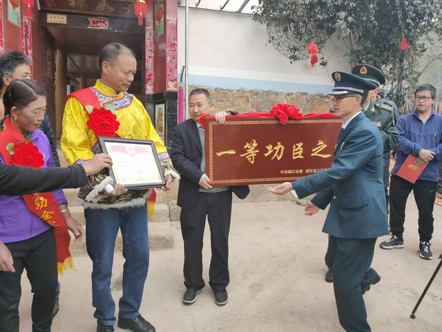 3月5日上午,市县两级退役军人事务局和丽江军分区、县武装部一行,为玉龙县九河乡金普村冷水沟组现役军人和浩琴家庭送去了“一等功臣之家”荣誉牌匾和一等功喜报。同时代表丽江市县两级党委政府以及部队向和浩琴家属表示热烈祝贺及亲切问候。