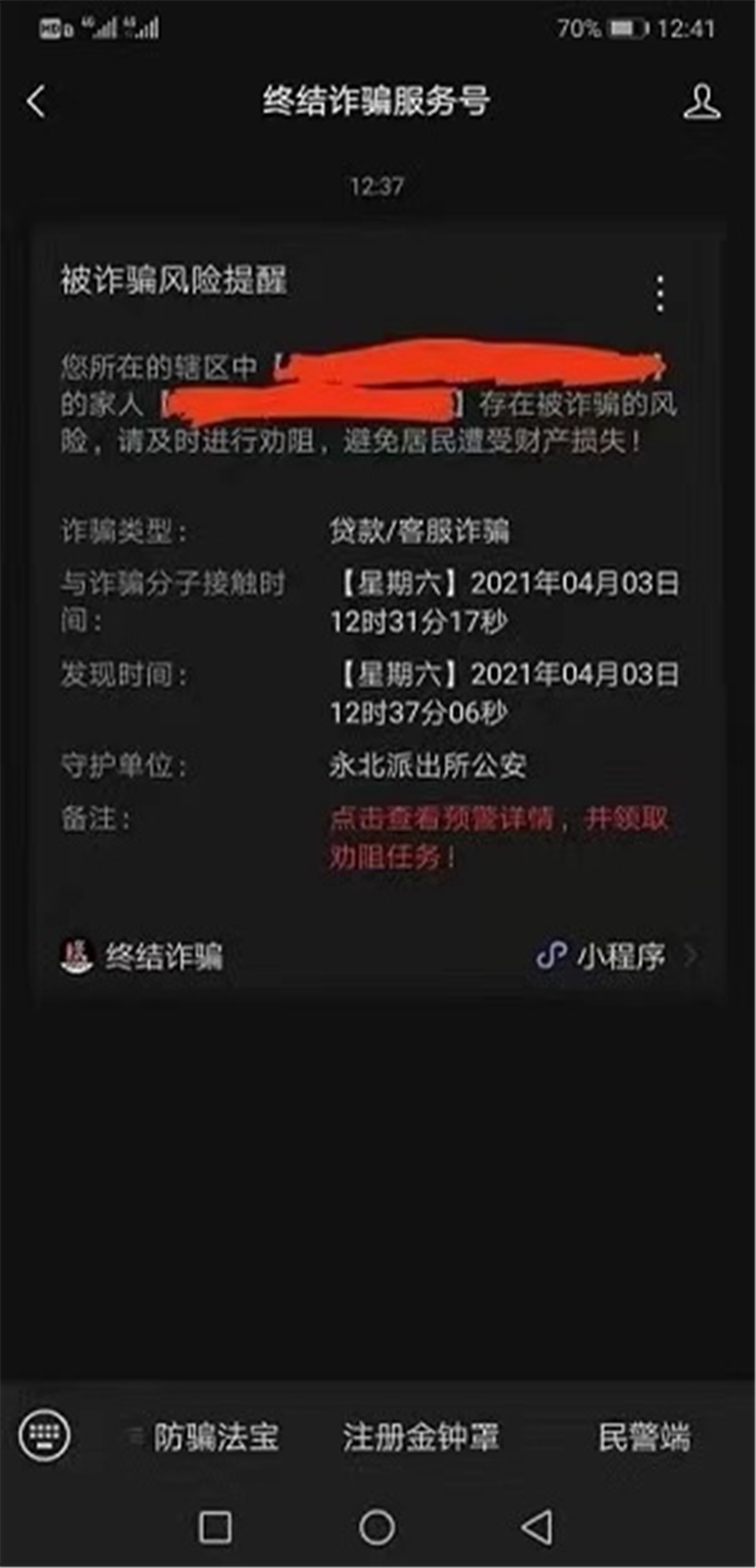 民警能够获知这一情况,就是通过金钟罩小程序的功能。它可以对注册者及其添加的家人实时进行精准的被诈骗风险提醒。当注册者及其家人接到疑似诈骗电话、短信,点击疑似诈骗网址、下载疑似诈骗APP时,手机会提示“有被诈骗的风险”。同时公安系统也会在后台收到预警信息,并及时进行干预,确保群众财产安全。