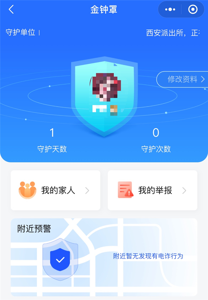据了解,“金钟罩”是警方推广的一款防范电信网络诈骗的小程序,以“终结诈骗服务号”为依托,实现管理端、民警端、居民端三端同步,依据后台大数据,实时防护预警准确、及时劝阻,24小时守护市民的“钱袋子”,有效预防、预警诈骗陷阱,给市民最安心安全的防护。
