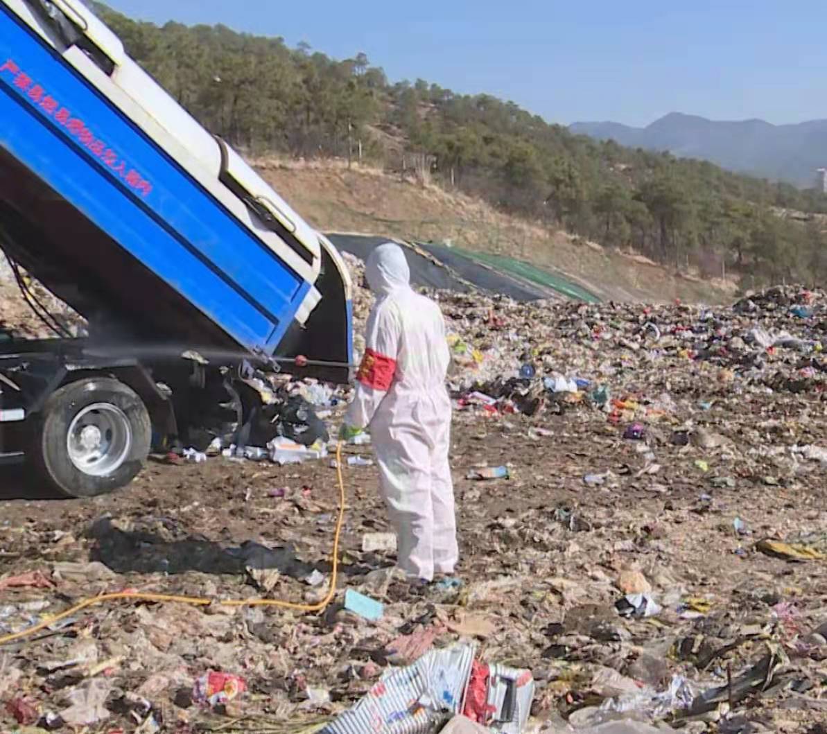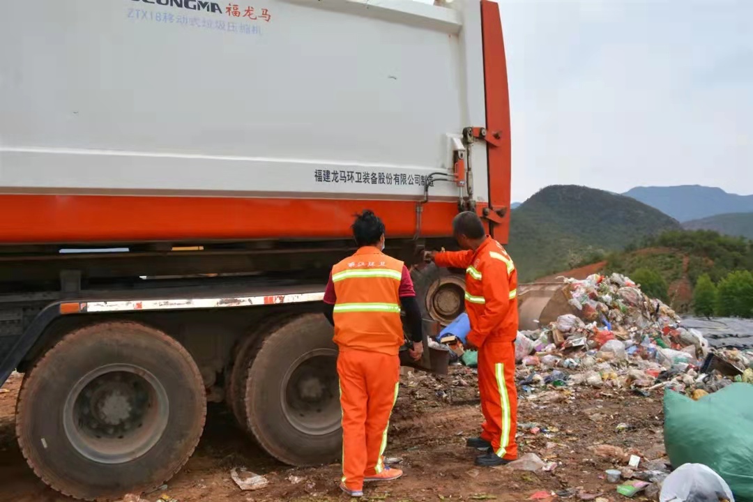 文化垃圾填埋场,距丽江中心城区26公里。这个填埋场承担着丽江城区所有生活垃圾的处置工作,平均每天约440吨,七八月份日均超500吨,最高的时候达到了520吨。这些垃圾从城区各处运至垃圾填埋场以后,由木江胡带领填埋场工人们将垃圾进行规范处置、填埋。