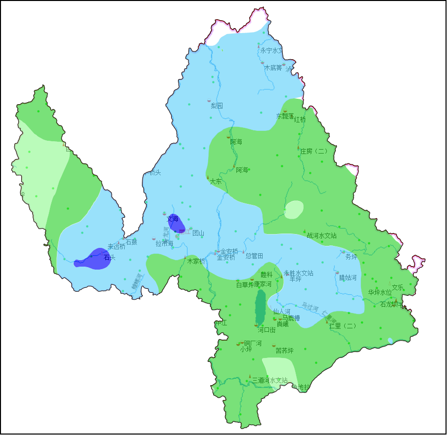 过去24小时,漾弓江流域面平均雨量41.7毫米,最大累计降雨量为67.6毫米,发生在古城区西安街道清溪水库雨量站。