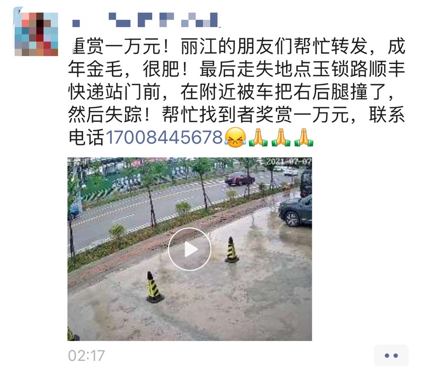王女士朋友圈满满都是寻找爱犬的消息,昨晚她一夜未眠。记者了解到王女士和爱犬感情深厚,从小养到现在,现在狗狗的年龄3岁,左右两边都打了狗狗芯片。“我是开客栈的,我把七仔从东北带到丽江,三年来它一直陪伴在身边,它很喜欢坐车。我不管到哪都会带着它,来店的很多客人也非常喜欢七仔,每天都会和它玩,和它拍照,甚至也有人因为看到七仔照片住到我们客栈!”