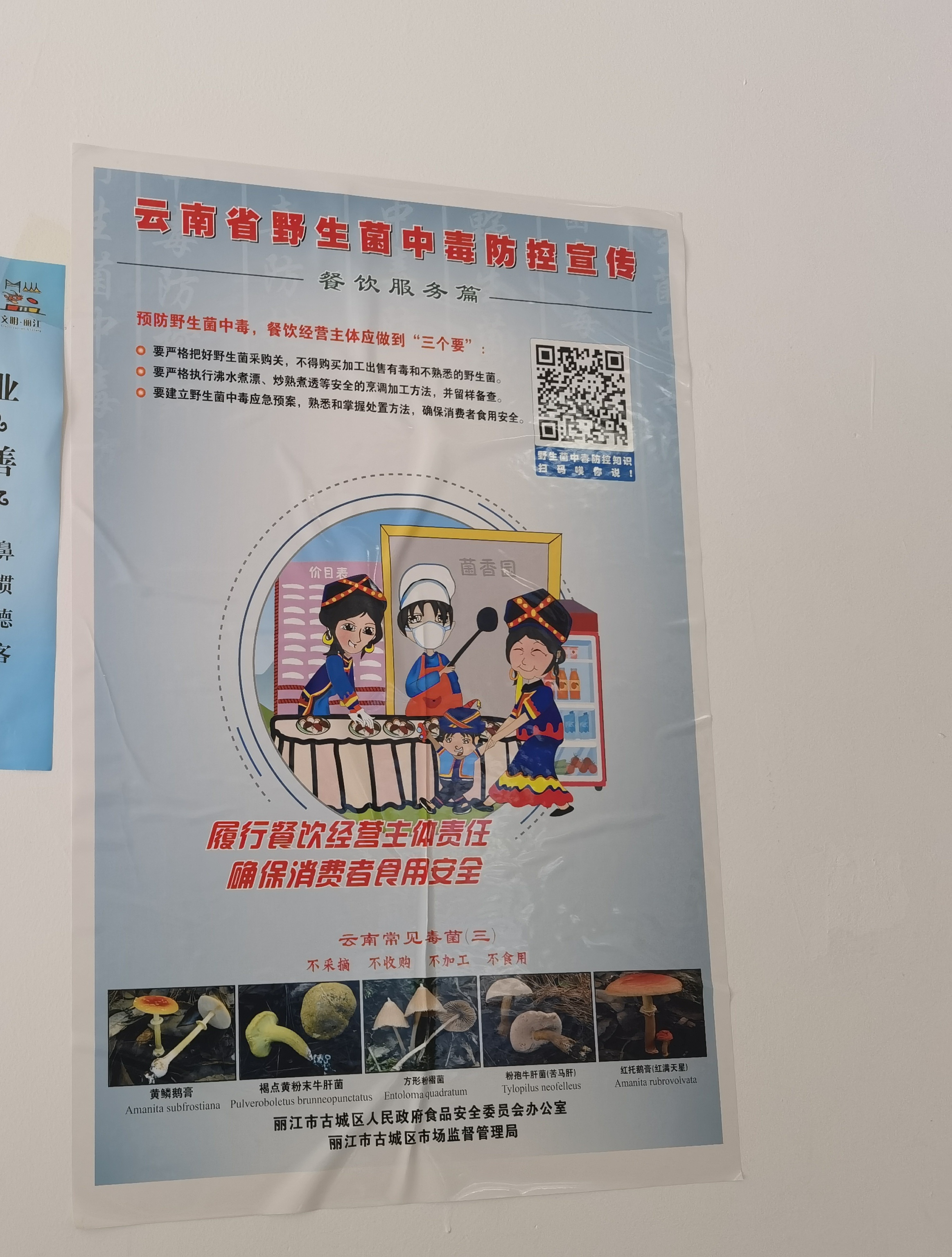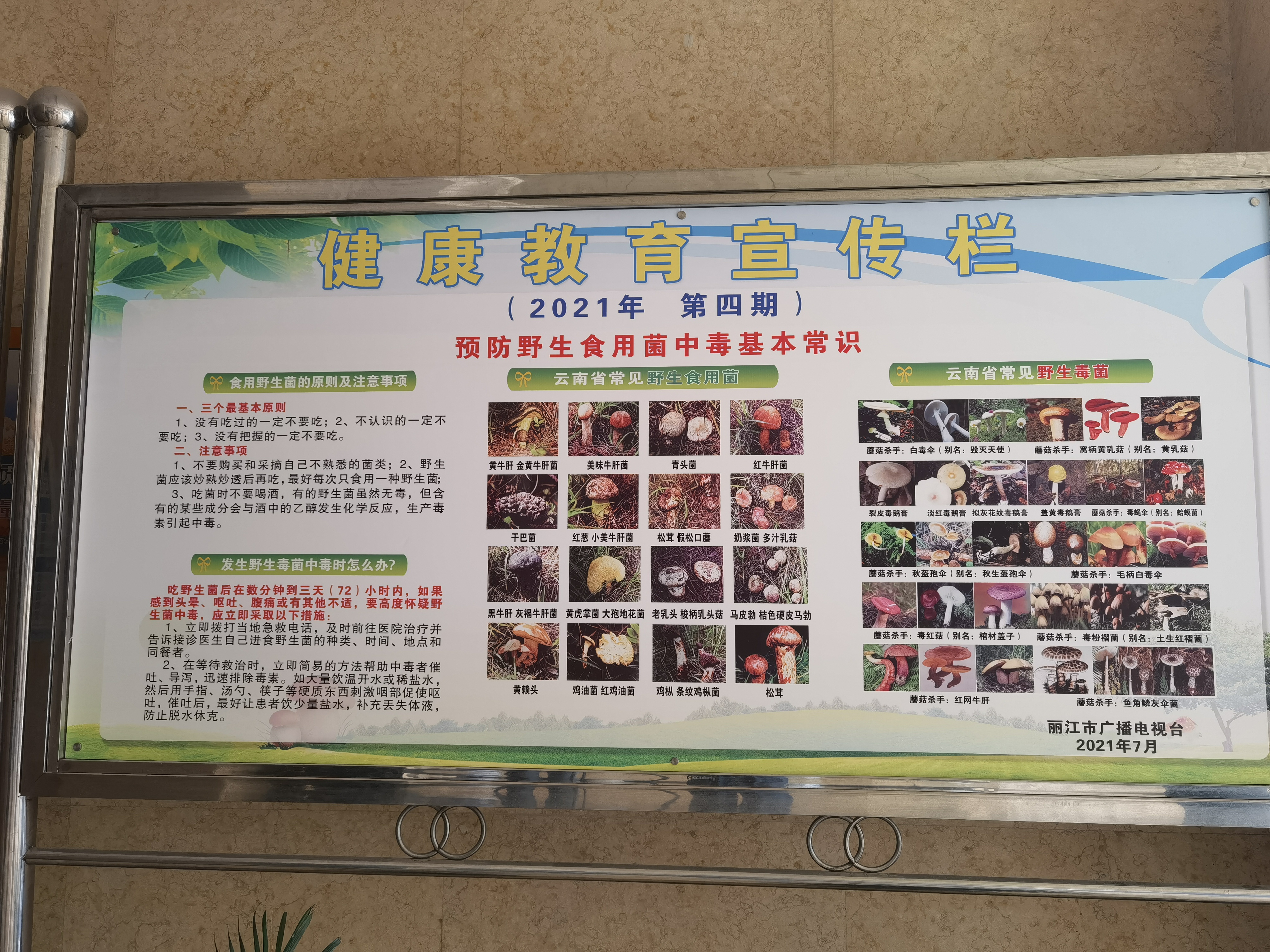 在丽江某家餐馆里 ,记者看到墙上粘贴的野生菌中毒防控宣传,要求预防野生菌中毒,餐饮经营主体应做到“三个要”,除此之外,单位机构大厅里摆放的健康教育宣传栏也明显的呈现了预防野生食用菌中毒的基本常识。