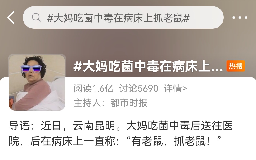近日,昆明一大妈吃菌中毒送往医院,后在病床上一直称:“有老鼠,抓老鼠!”
