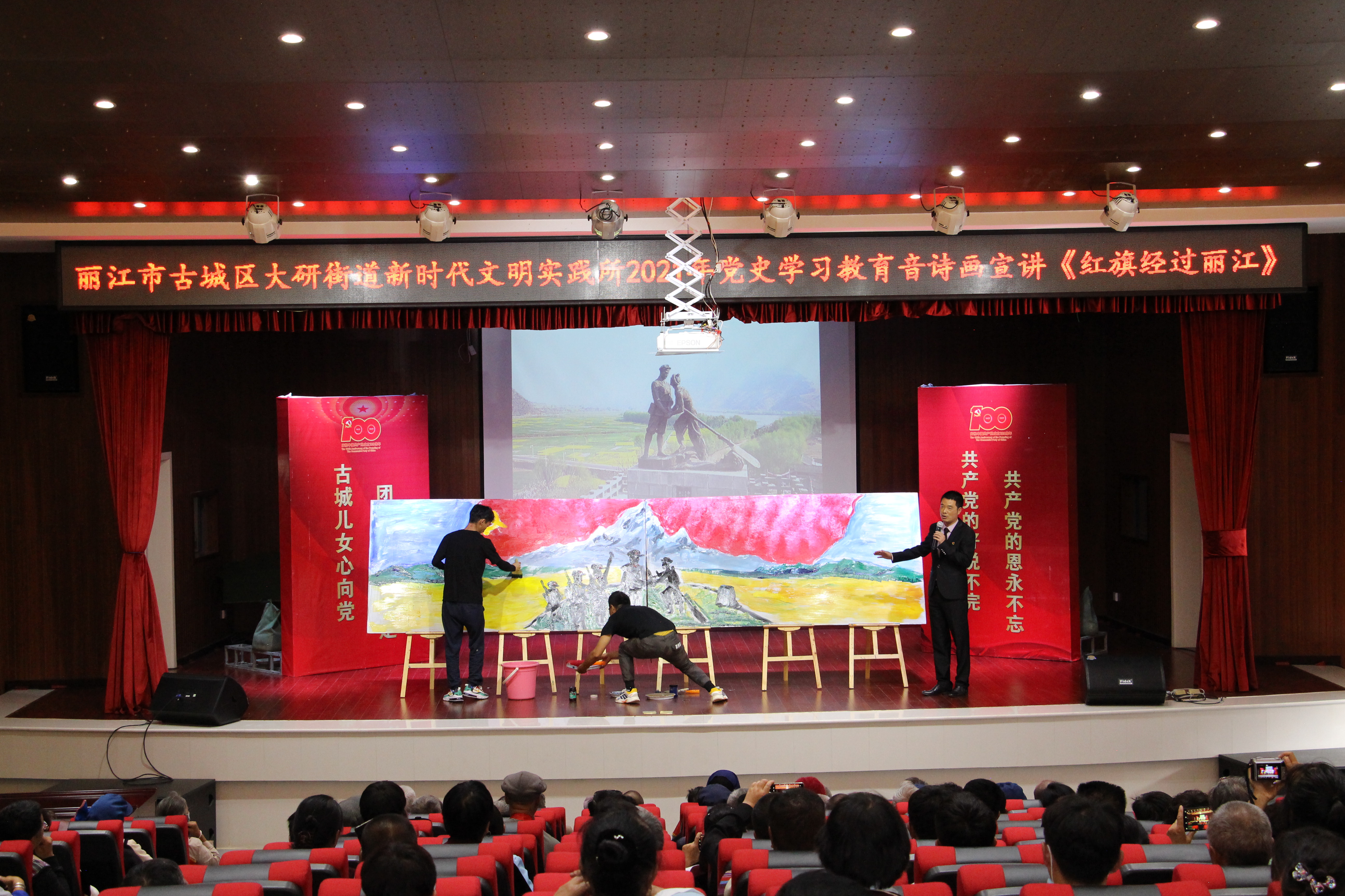 寨后上村快板队创作的纳西快板《中国共产党百年丰功伟绩说不尽》,讲述了党的领导下寨后上村发生了翻天覆地的变化;宣讲员邓骁演讲的《窗外》,从另一个视角讲述了张桂梅老师的奉献与坚守;宣讲员和玉玲、徐丽源宣讲的《她为和平而生》,讲述了纳西族的好女儿、维和女英雄和志虹的故事;文荣学校选送的由三位老师创作的音诗画宣讲作品《红旗经过丽江》,为大家讲述了1936年红军长征过丽江的故事以及红色革命思想对丽江的深刻影响,三位宣讲员边宣讲边作画,既讲出了红军经过丽江,播撒革命火种的难忘经历,又画出了一幅红军过丽江的壮丽画卷,耳目一新的文艺宣讲方式,让听众对党史知识有了更为深切的理解和掌握。