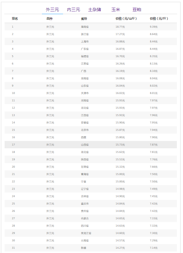 7月15日全国外三元生猪价格排行榜
