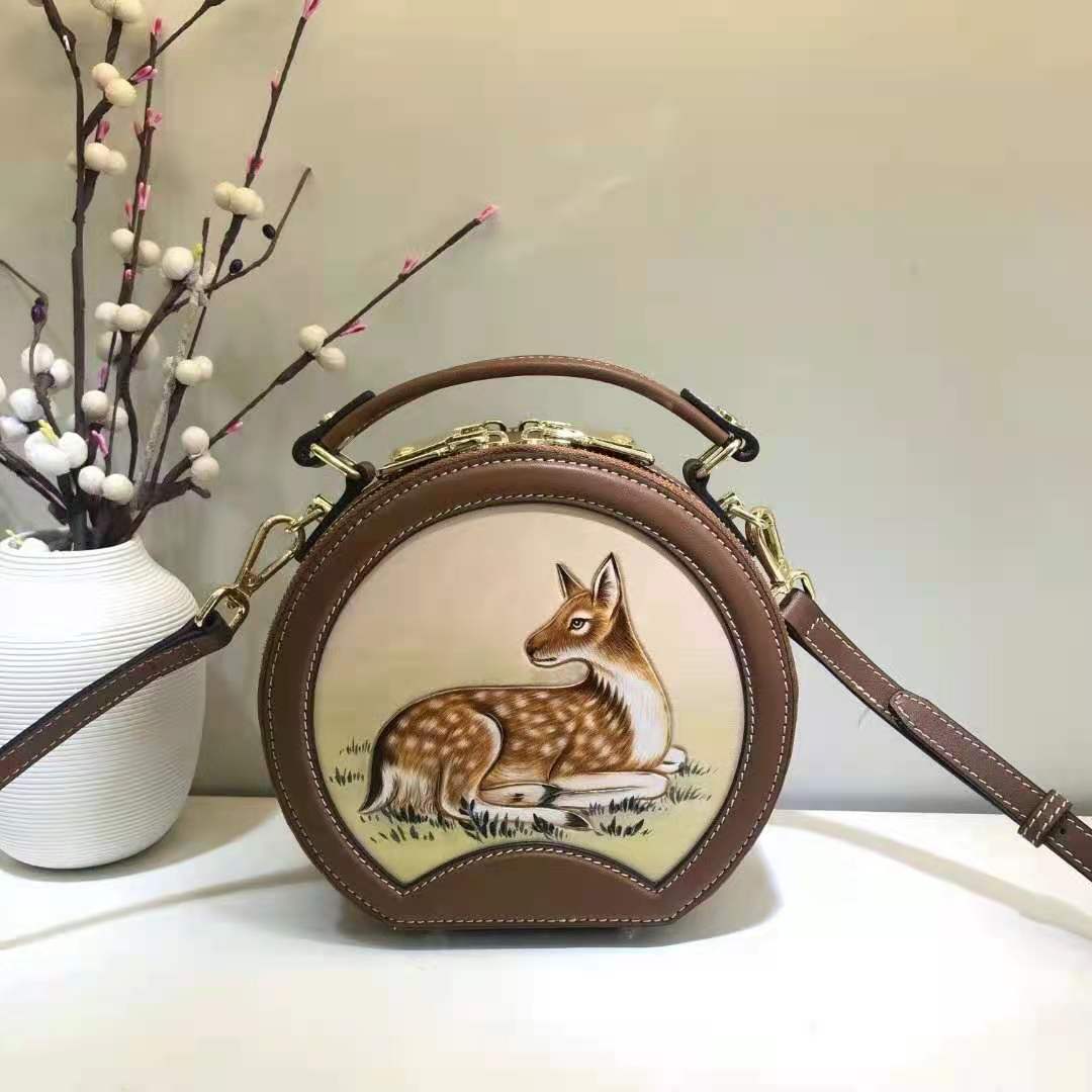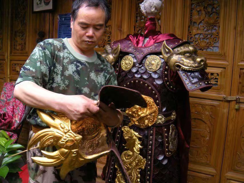 他以独特的创作构思和因材施艺的创作方法,充分发挥皮革材料的特性,凭借专业的工具及丰富多变的工艺技法(如雕刻、烫染等),用最传统的、原生态的皮革产品制作方法,对皮革进行裁切、打薄皮革、凿孔、组装金属零件、黏合、打磨、手工缝制等多道传统制作工序制作,最终获得完美的艺术效果。