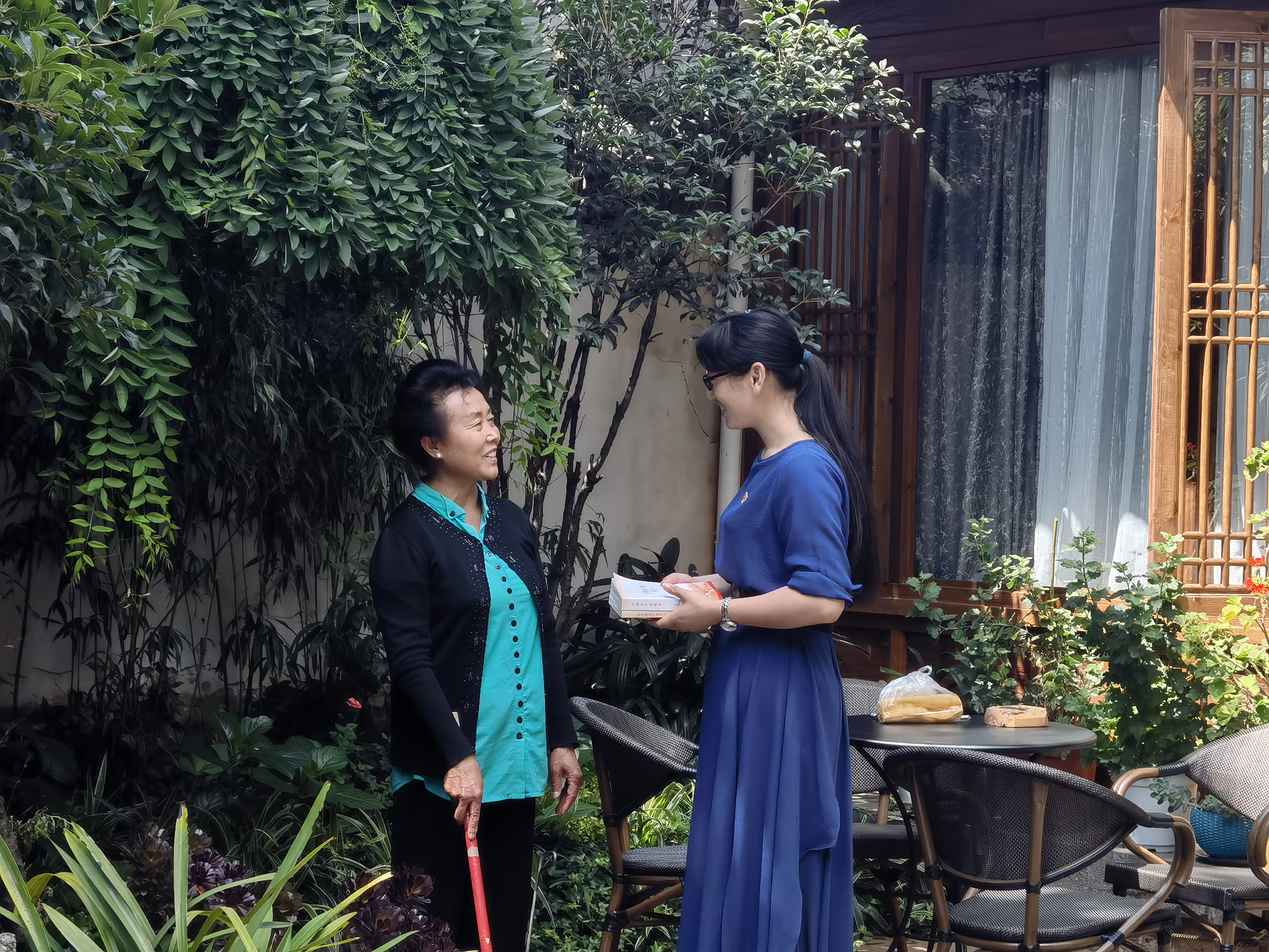 “奶奶,我是新义社区先锋支队的宣传委员和嘉新,今天我上门来呀是来跟您聊聊天,还带来了两本书。”今年68岁的杨奶奶正在院里头打扫卫生,听到门口传来的声音。