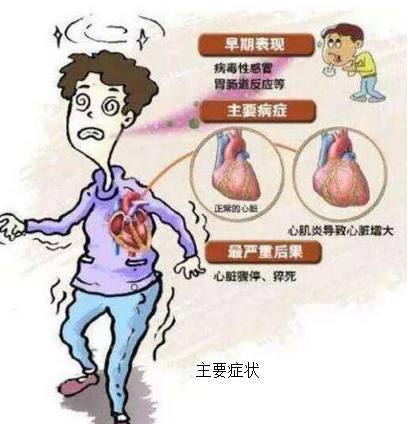 典型的病毒性心肌炎病例在心脏症状出现前数天可有发热、头痛、咳嗽、咽痛、关节痛、肌肉痛、全身不适等表现,这些表现与感冒颇有相似之处,部分病人则可出现恶心、呕吐、腹泻等胃肠道感染症状:感冒或胃肠道症状好转或消失后,心脏异常的征象开始显现,比如心跳加快或明显减慢、胸闷、胸痛、头晕、呼吸困难、精神萎靡或烦躁不安、面色苍白、出冷汗、食欲不振或反复出现恶心呕吐、上腹部疼痛:严重时可出现气促、反复晕厥,甚至猝死。