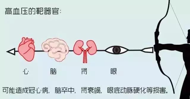 肾:高血压引起肾小动脉硬化,导致肾萎缩和肾功能衰竭、尿毒症。