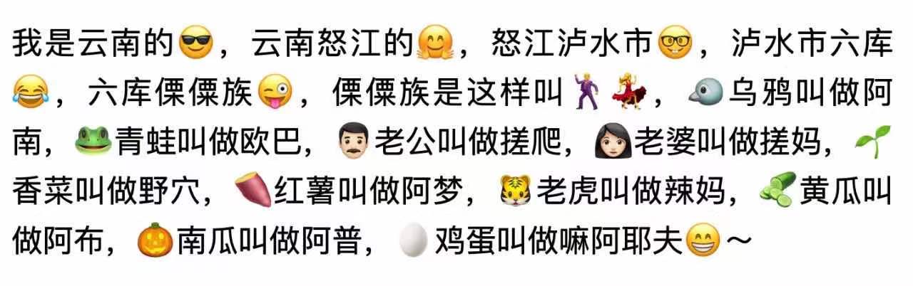 “我是云南的,云南丽江的,丽江玉龙的,会说纳西话,纳西话是这样说,吃饭是哈滋,喝水是几特,犁田是呃犁,游泳是几着......”丽江网友也纷纷上线,宣传着民族文化!
