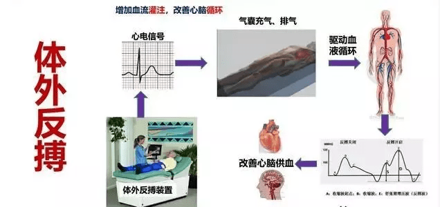 体外反搏的原理就是在患者双下肢用气囊根据心脏的跳动节律进行有规律的加压和放松,像一个泵一样,在心脏舒张充血时,下肢气囊加压促进血液进入心腔,促进心脏供血;心脏收缩射血时,下肢气囊放气,使心脏的血液在虹吸的作用下,充分的进入体循环,减轻心脏负荷,这样被动的锻炼可以在病人不动的情况下使心脏进行充分的活动,促进心脏侧支循环的建立,像大树一样,使心脏血管网枝繁叶茂,在心脏分支出现缺血缺氧时,起到自身桥血管作用。