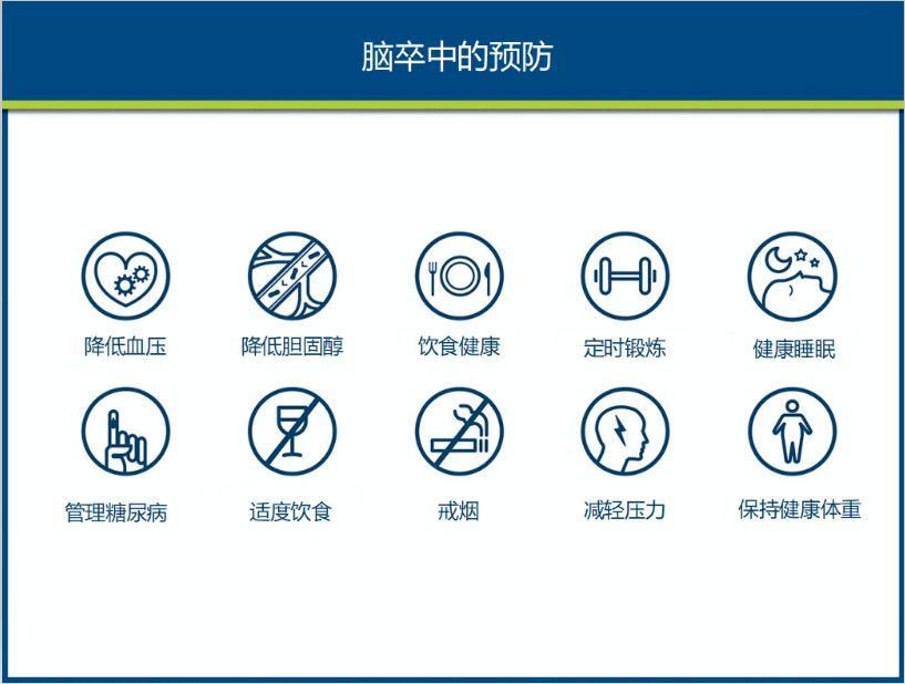 记住预防脑卒中五步口诀:一动:每天活动半小时以上;二不:不抽烟,不酗酒;三餐:营养均衡。四调:调节情绪,调整压力;五理:调理降低(血压、血糖、血脂、同型半胱氨酸、血液粘稠度)