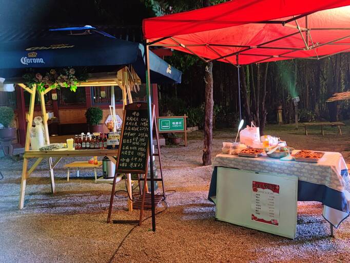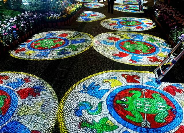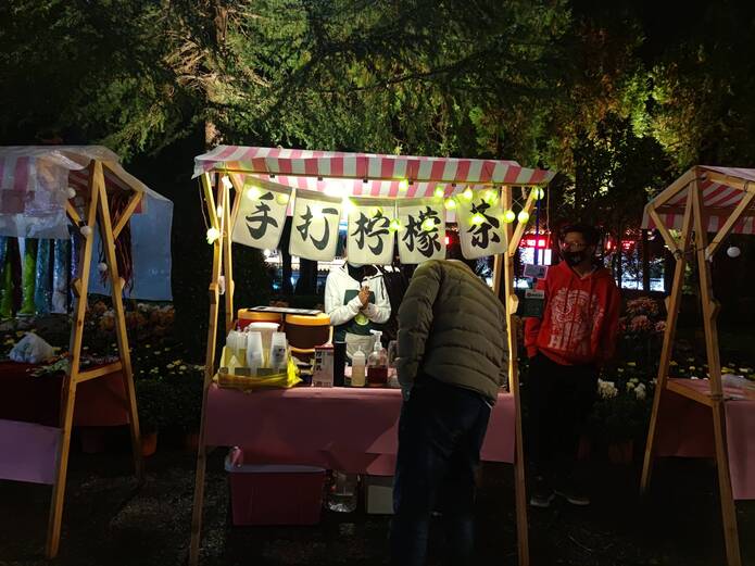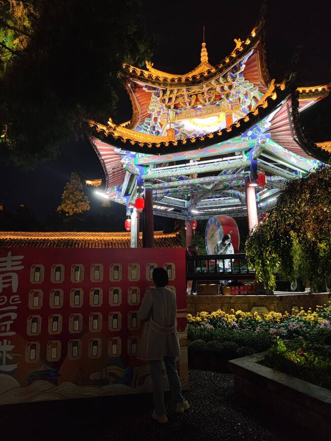万古楼南面区域以暖黄为主,亭子在这样的灯光下显得通透明亮;地面是采用投影呈现的繁华盛开、以及纳西族“巴格图”图案;将现代审美与民族文化相结合,漫步其中,形成步步生花,一步一景的画面带来新的视觉体验。在狮子山景区夜市,商家还售卖各种商品,增强游客的体验感、参与感,延长游客停留时间。