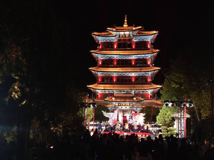 万古楼楼体则采用了见光不见灯的安装方式。灯光布置分为两层,一是重点突出屋面瓦顶与翘角;二是檐口的照明用来反应檐下精美的彩绘图案。万古楼夜间灯光技术的提升使得建筑的特色和细节更加明显,也体现了民间能工巧匠在建筑方面的智慧。在万古楼地面,采用花卉、蝴蝶、巴格图作为投影内容,将现代审美与民族文化相结合,带来新的视觉体验。