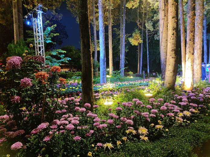 狮子山景区内夜游灯光提取民族文化元素为载体,打造了动态水波纹灯、丛林物语景观、水雾和灯光结合的时空隧道等多种绚烂灯光。此外,还借助生态小品灯还原了丽江十二景之“黄山栖鹤”,沿着古朴的石阶径直而上,隐隐听到几声仙鹤的啼叫从林中传来,声音是从森林中的仙鹤小品灯发出的,用灯光演绎出了故事的本身。