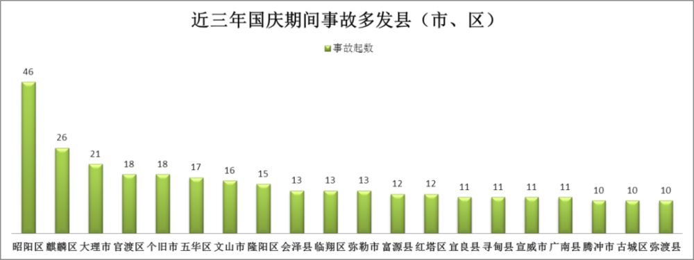 (一)出昆高速及旅游热点州市事故突出。国庆假期日均发生简易程序事故是平时简易程序事故的1.25倍,如图1所示。从各县(市、区)情况看,发生过10起以上一般程序事故的县(市、区)有20个。(如图2所示)