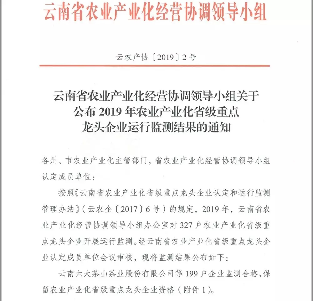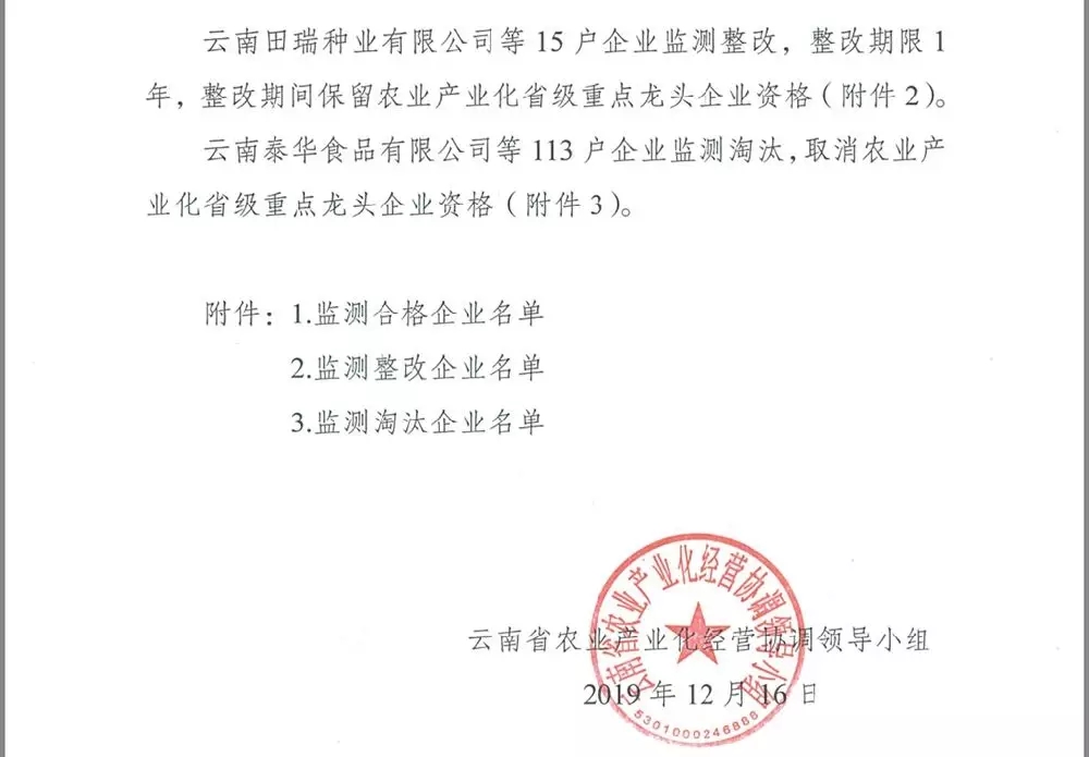 云南六大茶山等199户企业监测合格,保留农业产业化省级重点龙头企业资格。云南田瑞种业公司等15户企业监测整改,整改期限一年,整改期间保留农业产业化省级重点龙头企业资格。云南泰华食品公司等113户企业监测淘汰,取消农业产业化省级重点龙头企业资格。