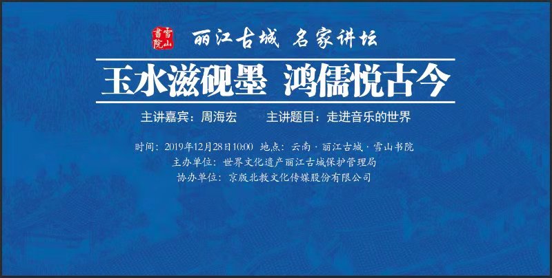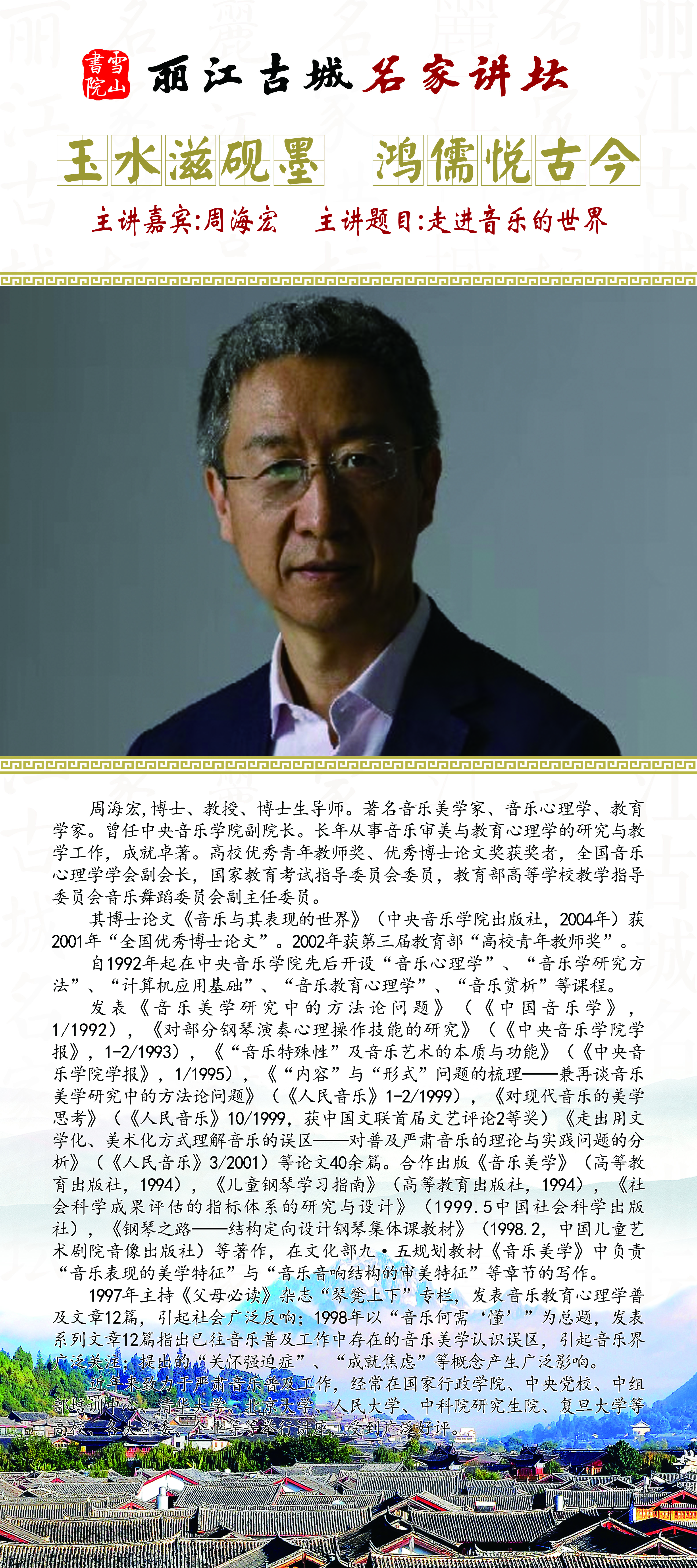 12月28日上午,丽江古城名家讲坛继续在雪山书院精彩开讲,著名音乐美学家、音乐心理学、教育学家周海宏以“走进音乐的世界”为主题,到场嘉宾进行分享。