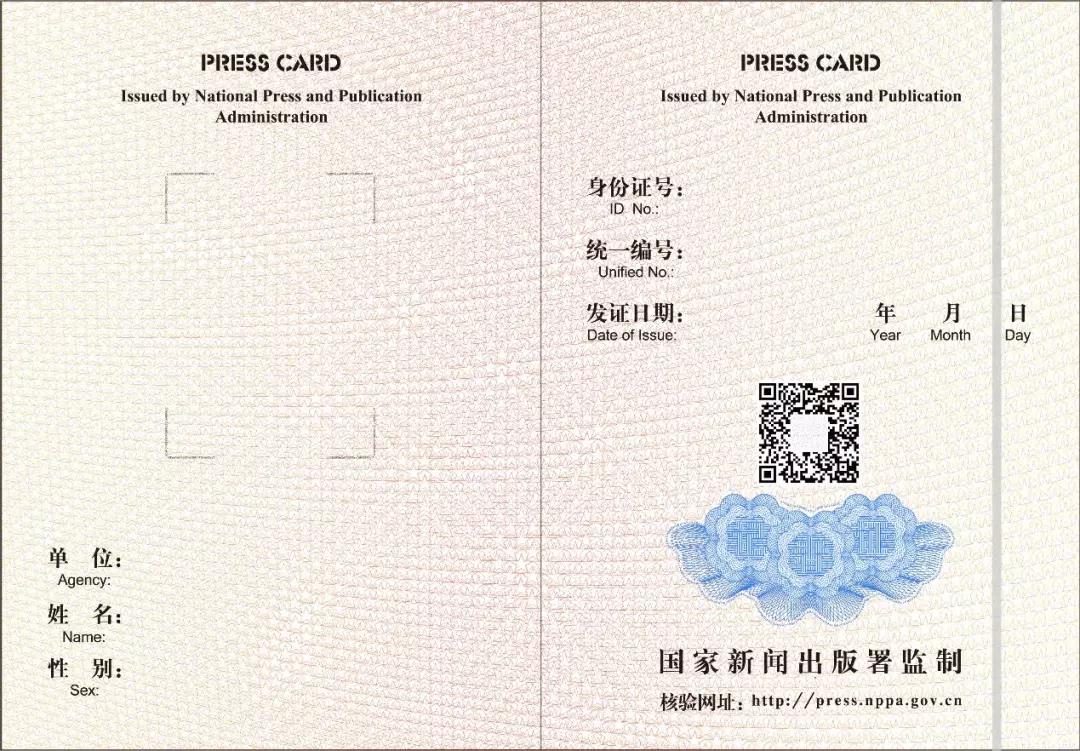 新版新闻记者证高107毫米,宽77毫米。红色封皮,封面凹烫印亮金色中华人民共和国国徽和“新闻记者证”中英文字样。
