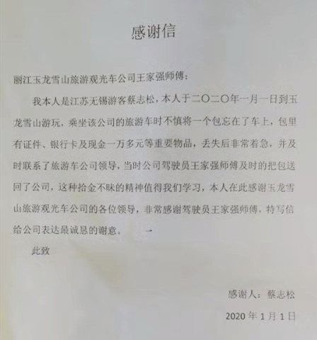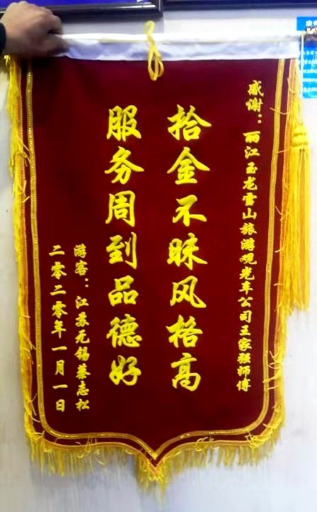 原来,江苏无锡游客蔡志松给丽江玉龙雪山旅游观光车公司的驾驶员王家强寄来了一封感谢信和一面锦旗。