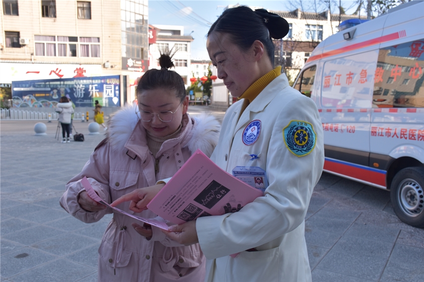 他人倒地,呼之不应,心肺复苏怎样做?怎样拨打120?家庭急救可能会救到人但也可能起到反作用,要注意哪些禁忌?1月20日,是全国“120急救宣传日”,当天,丽江市人民医院联合丽江市急救中心,在市医院新门诊楼前开展了“健康中国,急救护航”和“救在身边,志愿者在行动”主题活动。