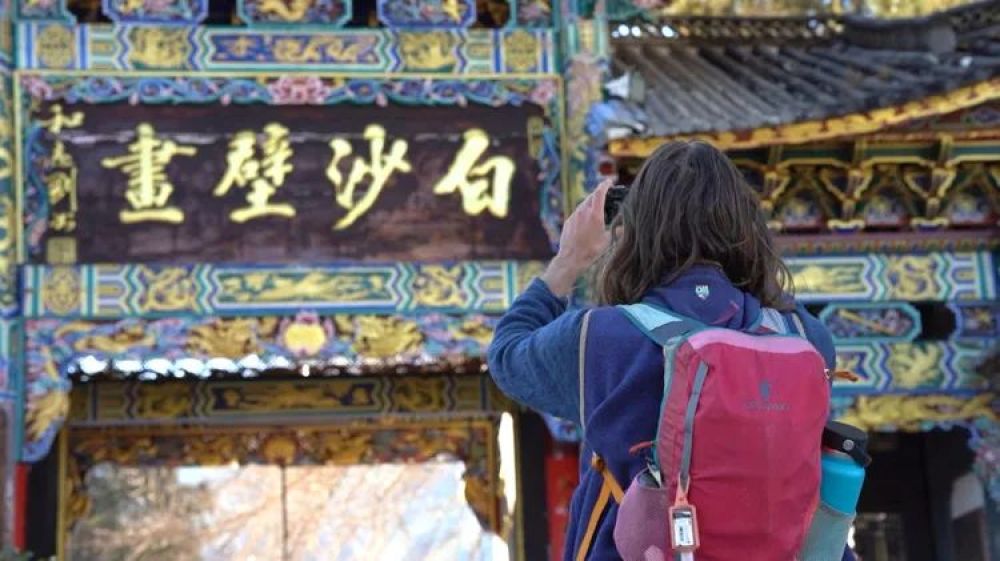 游客正在白沙壁画博物馆门前拍照留念。(丽江融媒记者 张小秋 摄)