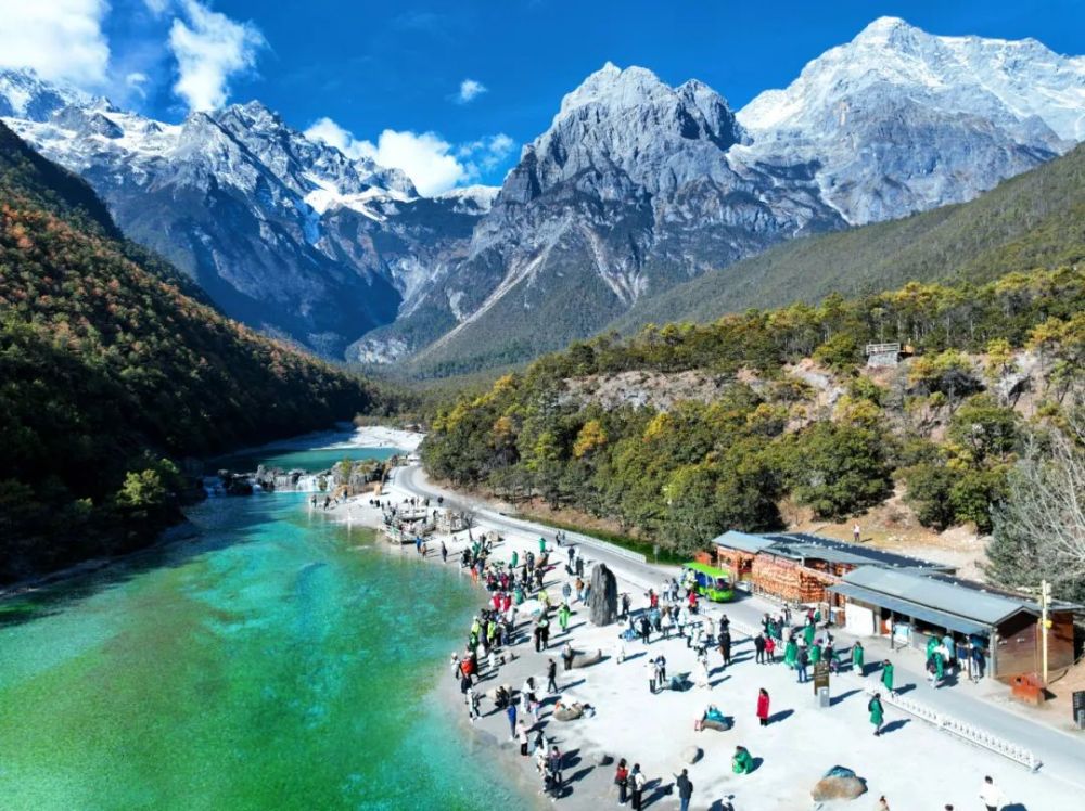 秋末的玉龙雪山层林尽染、白雪皑皑,蓝月湖如同一块巨大的蓝宝石静卧在山谷,清澈的冰川融水淙淙流过。在如画的风景中,摄影师们忙着给一对对新人拍下美美的婚纱照。秋日的玉龙雪山景区层林尽染,风景如画。游客漫步其间,赏美景、赞美景。(供图)