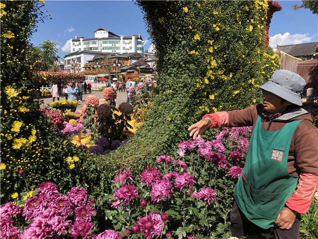 每年金秋时节,为了装扮古城,让游客和市民观赏到满城菊花的盛景,菊花展负责方恒玉花卉有限公司和大研街道办事处付出了艰辛。在整个菊花展期间,他们每天都派出10名左右的花工对菊花进行维护,负责浇水、修剪、养护等工作。每年他们都精心照顾种植的上万盆菊花,就是为了这一个月的惊艳亮相。今年恰逢新中国成立70周年大庆,花工们也做出了几个月的努力来完成菊花展中的多个与国庆主题相关的布展造景。