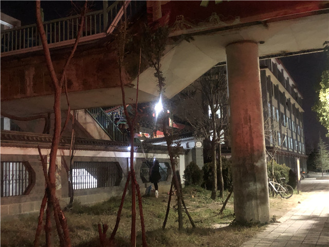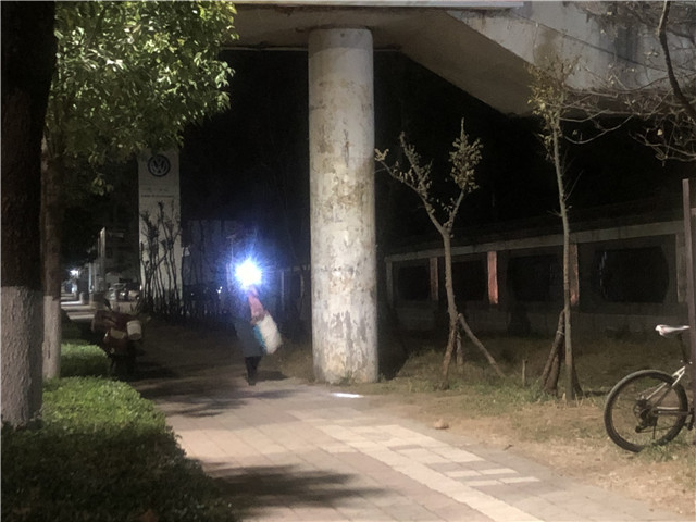 昨晚,记者来到玉龙县田家炳中学,21点30分左右,有一位阿姨骑着电动车出现在民族中学的天桥底下,打着一个手电筒,将售卖的小零食搬进学校围墙旁的绿化带内。