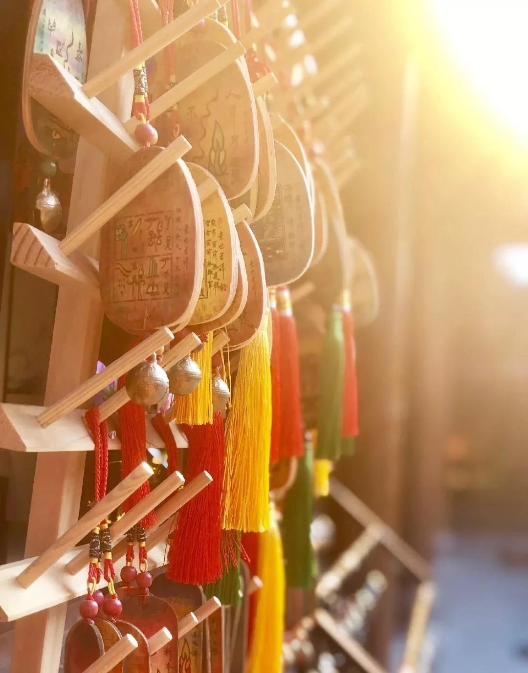 挂满彩色盆栽的墙、随风摇动的东巴风铃,