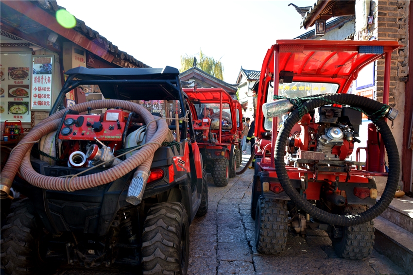 而此次演练的器材主要用的是各室外消火栓和机动泵,由于古城道路狭小,大车无法行进,只能依托天然水源和室外消火栓,用机动泵抽取古城河道里的水进行灭火处理。