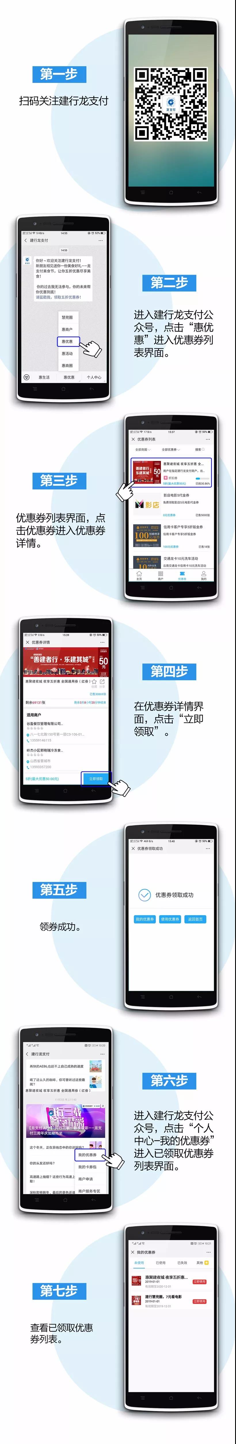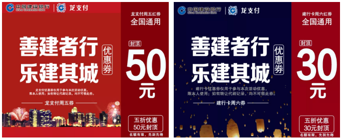 在指定商户、按约定方式、规范支付真实消费的,可使用本人领取的优惠券、在有效期内享受实际消费金额五折(龙支付50元封顶,建行卡30元封顶)指定券码直接抵用支付的优惠。