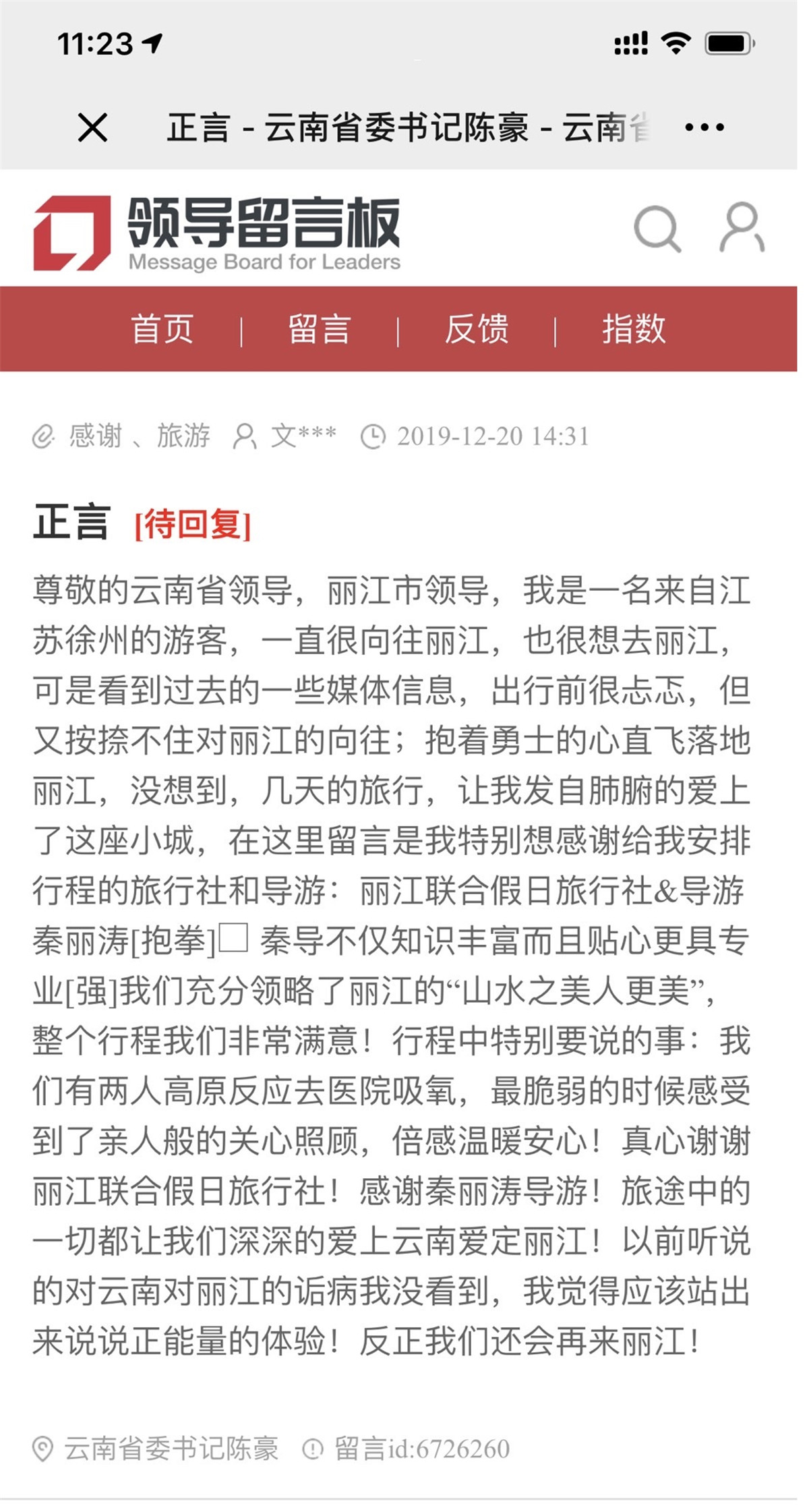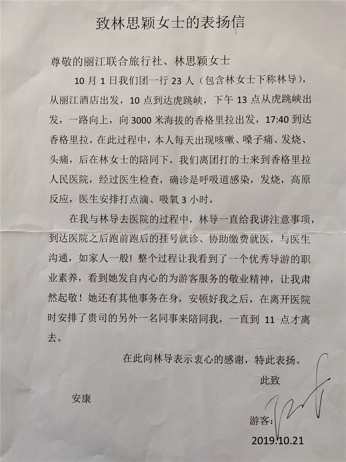 近日,一位来丽游客写信给云南省委书记陈豪表扬丽江联合假日旅行社的导游秦丽涛。