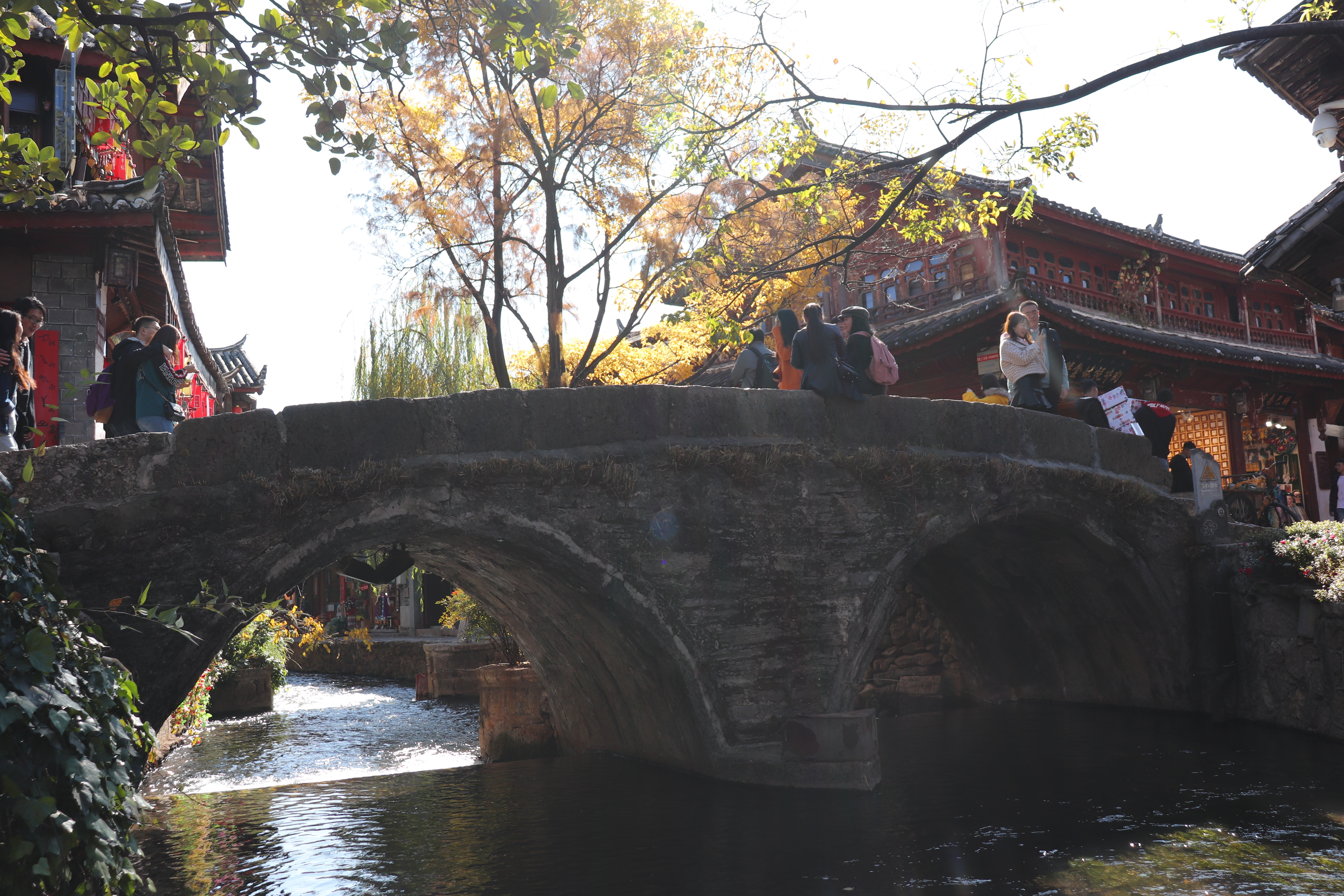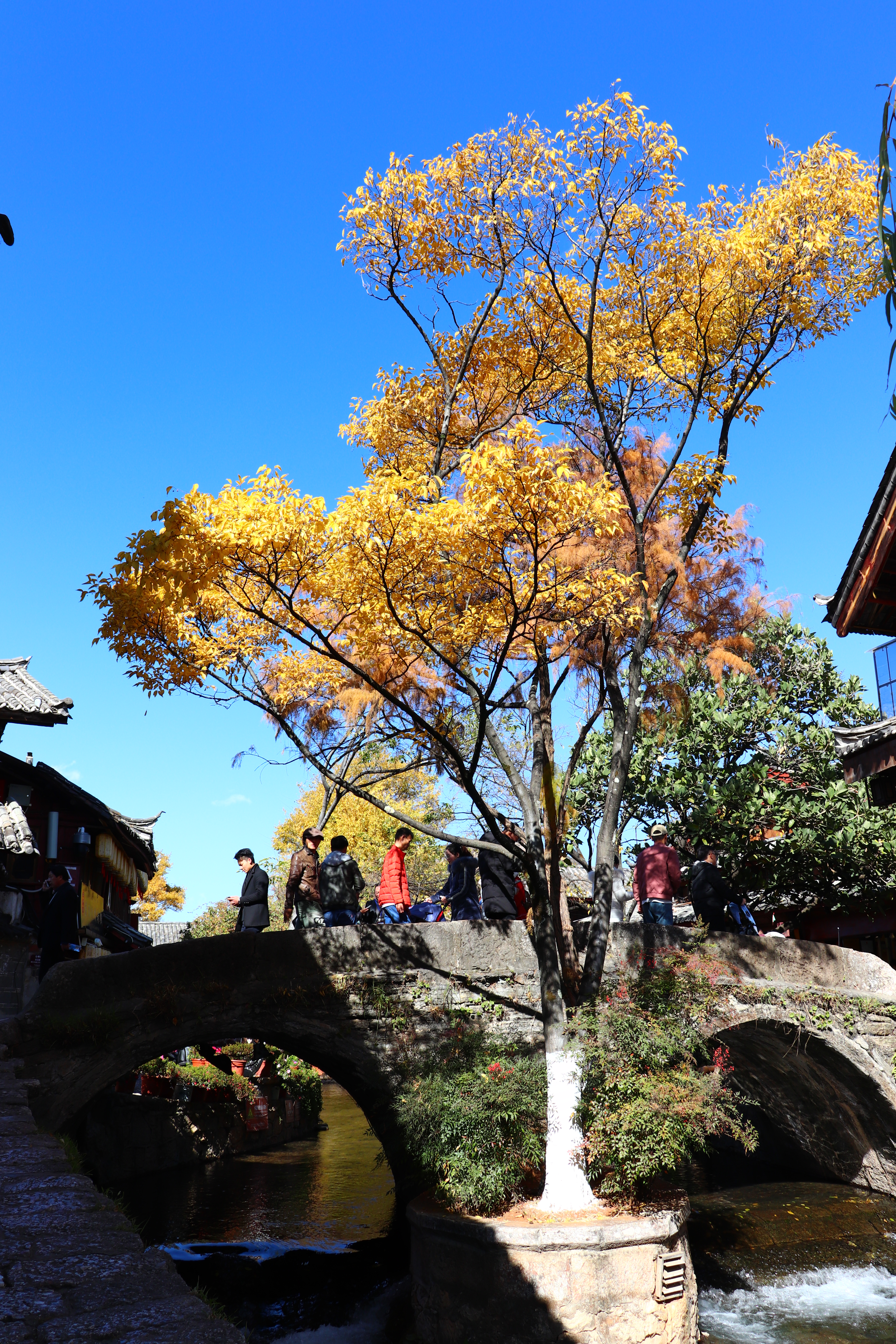 水是古城的灵魂,也柔软了古城的时光。似人的筋络遍布全城,完美并便利着古城万物,不仅是生活,还有花草树木和民居防火,小镇上的纳西人家把这一滴水的功能发挥到了极致。随之来到四方街,地势较高的西河水还多了一项日暮涤街的功能,傍晚时分茶马互市散场,南边桥下就有木板从两边卡口处落下堵水,逐渐升高的水在两桥间的缺口处一泻而下,裹挟着街面上细小的垃圾和灰尘前往中河,还四方街一个洁净的夜晚,为广场上的篝火打跳做好准备,也为劳动了一天的年青男女拉对象创造便利。纳西先民用石板路,水网和遍布的桥完成了科学精致的古城布局,随手一拍都是美景,真正是人在画中游。尤其是西河边往狮子山的途中,很多观景台喝茶发呆之余还可以俯瞰古城全貌。
