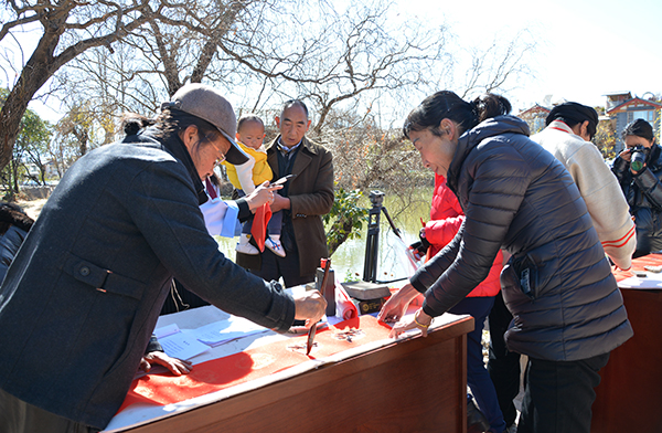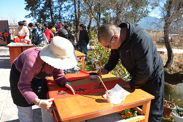 “‘事事如意大吉祥 家家顺心永安康’大门口要贴这对,帮忙用东巴文写下。”今天,在古城区大研街道文林村纳西民族文化园外,聚集了很多村民和游客,大家纷纷挑选过年自家需要张贴的对联。文化园内则欢歌乐舞,一场精彩的乡村春晚即将上演。